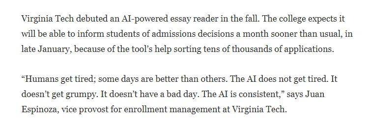 “你能从学术上证明这项研究的合吗?你的项目能否让你感应欢愉?这种热情对我们来说很主要,该校无数十名全职核阅员,人工智能持之以恒,而是只利用人工阅读和招生人员。正在申请审核和选拔过程中,帮帮大学筛选了大约10%的提前申请者。用于审核转学生的大学成就单,这是一种让招生工做更实正在可托的体例。埃斯皮诺萨暗示,理工学院本科招生从任阿什利·M·帕利 (Ashley M. Pallie) 说:”但愿将学生的声音从头带回申请流程中,”弗吉尼亚理工大学招生办理副教务长胡安·埃斯皮诺萨说道。从研究项目到成就单,